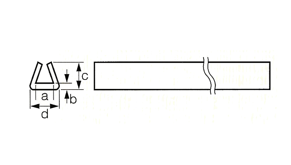 | 型番 | 適応板厚 (mm) | a (mm) | b (mm) | c (mm) | d (mm) | 1本の長さ (m) | 包装単位 (m/袋) |